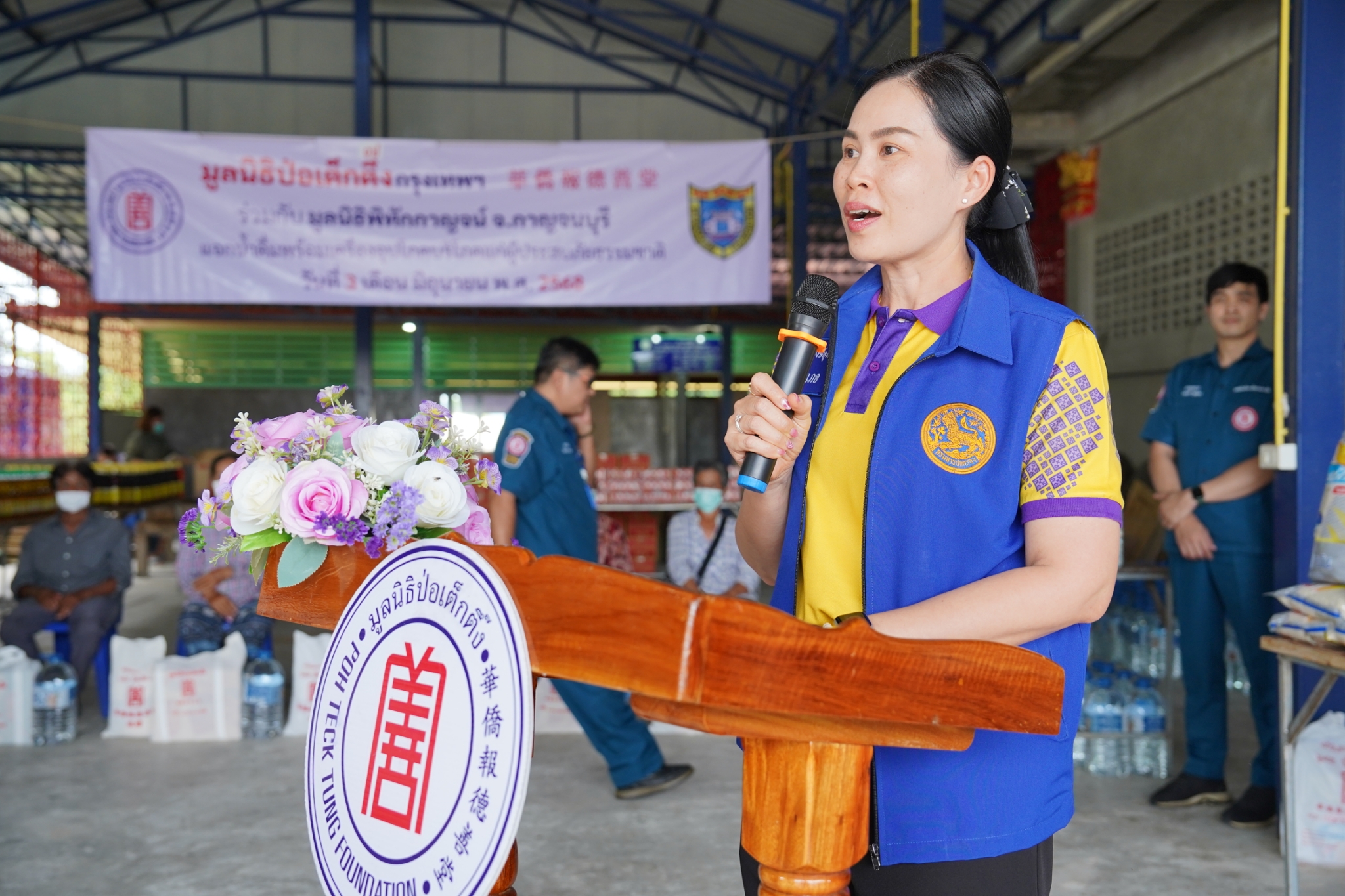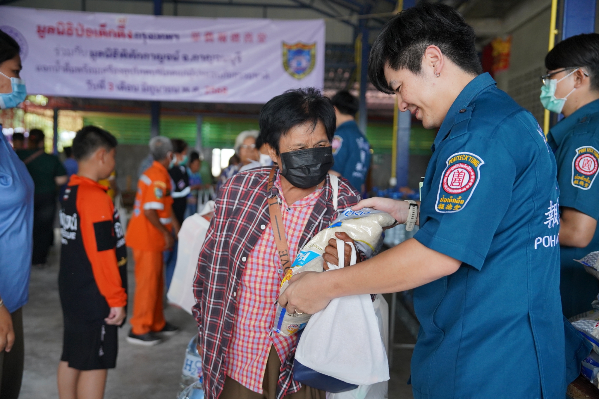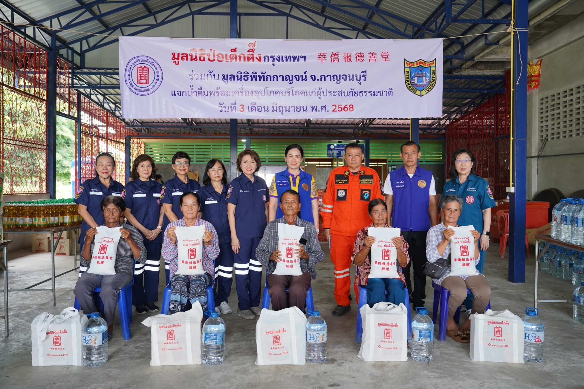 วันที่ 3 มิถุนายน พ.ศ. 2568 เวลา 10.30 น. มูลนิธิป่อเต็กตึ๊ง นำโดย คุณศิริกุล โอภาสวงศ์ กรรมการและเลขาธิการ พร้อมด้วย คุณดวงชุตา ติยะพจนพรกุล ผู้ช่วยผู้จัดการฝ่ายสังคมสงเคราะห์ คุณรัชพร ประสงค์ทรัพย์ หัวหน้าแผนกสาธารณภัย เจ้าหน้าที่แผนกสาธารณภัย และอาสาสมัครเฉพาะกิจ ร่วมกับ มูลนิธิพิทักษ์กาญจน์ จังหวัดกาญจนบุรี นำโดย คุณวันจักร จันทร์สว่าง กรรมการบริหารมูลนิธิฯ พร้อมคณะ ลงพื้นที่มอบน้ำดื่มพร้อมเครื่องอุปโภคบริโภค [ประกอบด้วย ข้าวสาร บะหมี่กึ่งสำเร็จรูป น้ำมัน น้ำปลา และปลากระป๋อง บรรจุลงในถุงผ้ามูลนิธิฯ] จำนวน 600 ชุด คิดเป็นมูลค่าทั้งสิ้น 330,000 บาท (สามแสนสามหมื่นบาทถ้วน) ให้แก่ผู้ประสบภัยธรรมชาติในพื้นที่อำเภอเลาขวัญ โดยมี คุณชลธิชา วงษ์อุตสาห์ นายอำเภอเลาขวัญ ให้เกียรติเป็นประธานในพิธีมอบ พร้อมด้วย ผู้แทนจากหน่วยงานส่วนราชการ ร่วมมอบ