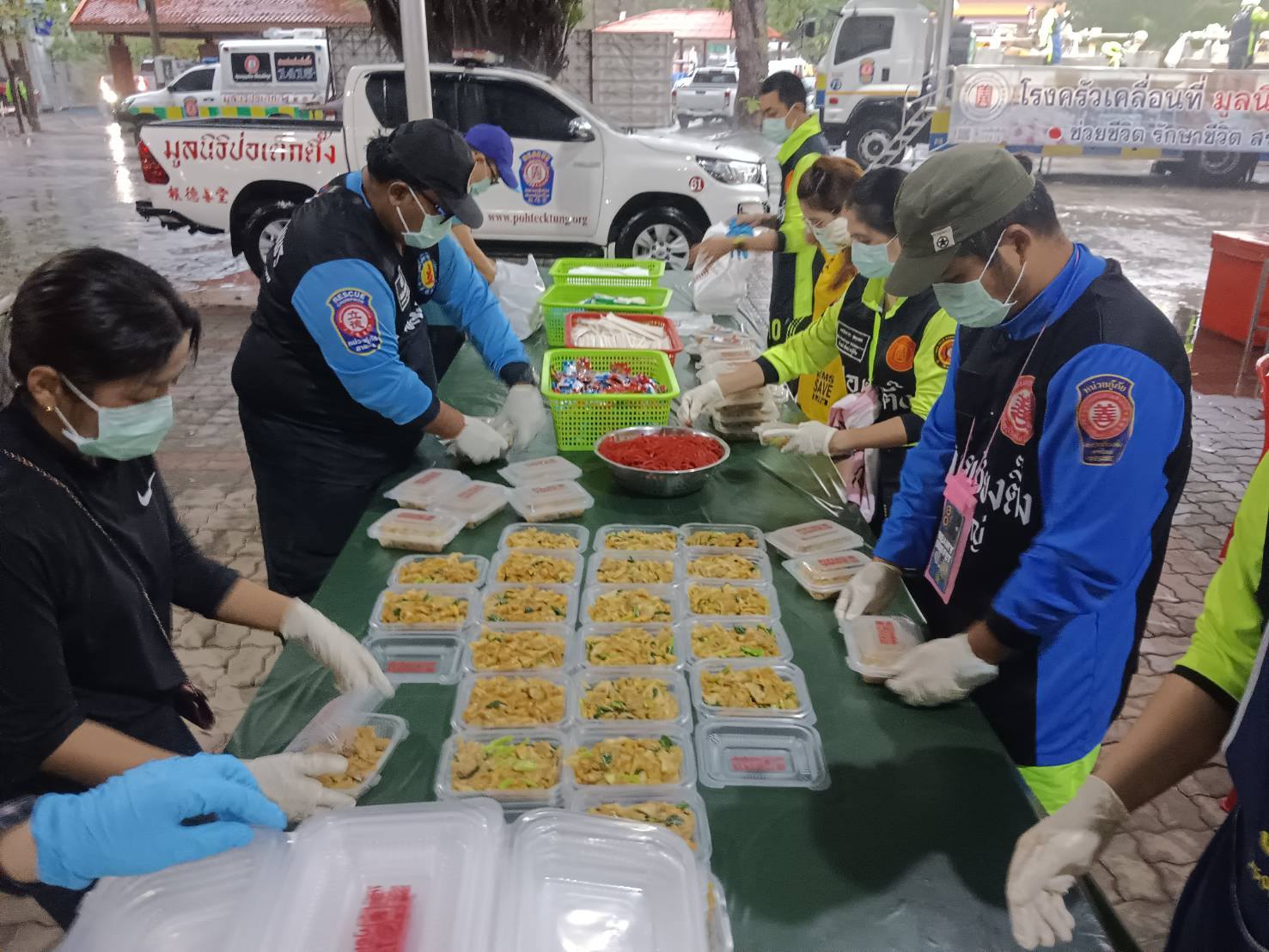 เช้าวันนี้ (24 พฤศจิกายน พ.ศ. 2568) ที่โรงครัวเคลื่อนที่มูลนิธิป่อเต็กตึ๊ง ภายในบริเวณวัดคลองเรียน เจ้าหน้าที่และอาสาสมัครมูลนิธิฯ ร่วมกับ กู้ภัยท่งเซียเซี่ยงตึ๊ง เร่งประกอบอาหารปรุงสุกบรรจุกล่อง เพื่อเตรียมออกแจกจ่ายให้แก่ผู้ประสบภัยในวันนี้ ซึ่งขณะนี้ยังคงมีฝนตกอย่างต่อเนื่อง